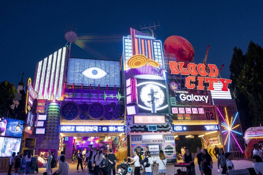 블러드시티는 매년 가을 새로운 스토리와 이색 콜라보를 선보이며 공포체험 성지로 자리매김해 왔다. 지난해에는 '오징어게임'으로 미국 에미상을 수상했던 채경선 미술감독과 함께 사이버펑크풍의 이색 체험 공간을 조성했다.