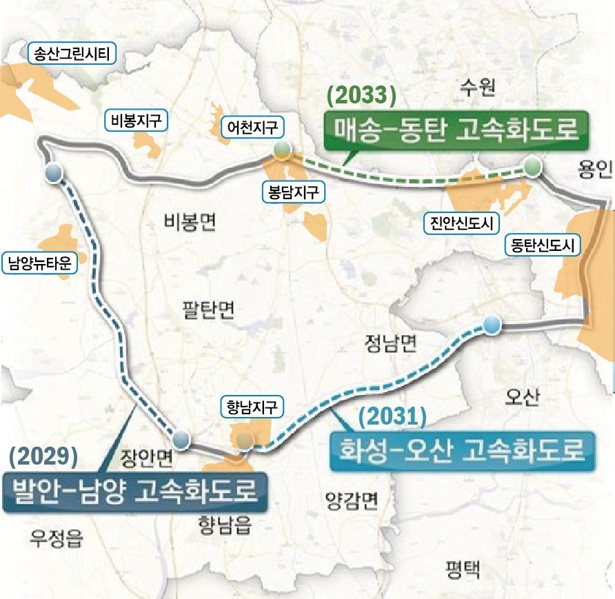 '매송~동탄 고속화도로'는 봉담신도시와 개발 예정인 진안신도시를 최단거리로 연결하는 노선이다. 도로망이 완성되면 매송에서 진안을 지나 동탄 삼성캠퍼스까지 이동 시간이 50분에서 26분으로 절반 가까이 단축된다. 기존 비봉~매송 간 도시고속도로와 연계해 연장 10㎞, 왕복 4차로로 건설된다. 오는 2033년 개통 목표다.