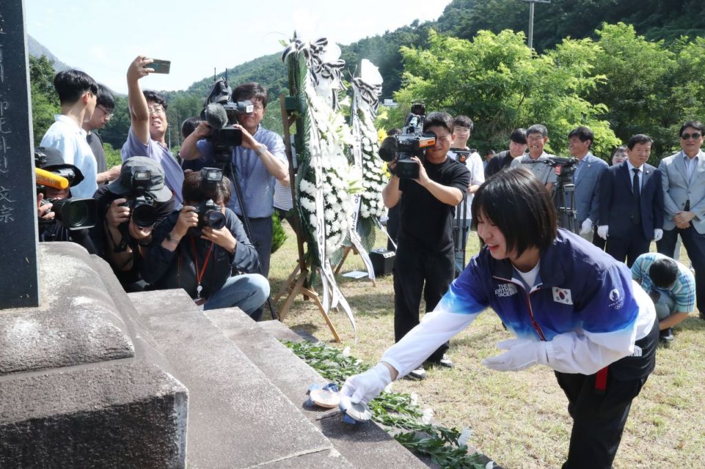 2024 파리올림픽 유도 여자 57kg급에서 은메달, 혼성 단체전에서 동메달을 딴 허미미 선수가 6일 오전 대구 군위군 삼국유사면 화수리에 조성된 독립운동가이자 현조부인 허석 지사의 기적비를 찾아 참배하고 올림픽 메달을 올려놓고 있다. [사진출처=연합뉴스]