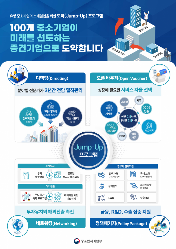 중소벤처기업부가 유망 중소기업 100개를 선정해 중견기업으로 키우기 위한 '점프업(도약) 프로그램'을 추진한다.