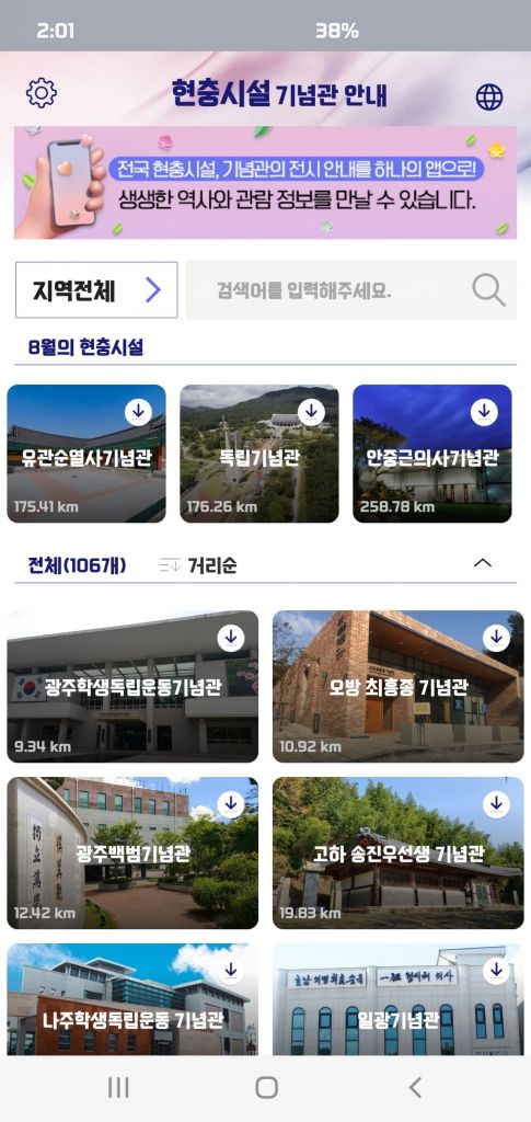 앱에서 만나볼 수 있는 현충시설은 광주백범기념관 및 오방최흥종기념관을 비롯해 서울 서대문형무소역사관, 충남 독립기념관, 부산 유엔평화기념관, 제주항일기념관 등 전국 99개 기념관이다.