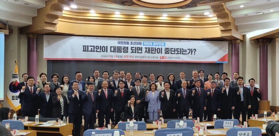 국민의힘 초선 공부모임 참석자들이 지난 6월24일 국회에서 '피고인이 대통령이 되면 재판이 중단되는가'를 주제로 모임을 열고 사진촬영을 하고 있다. [사진=국민의힘]
