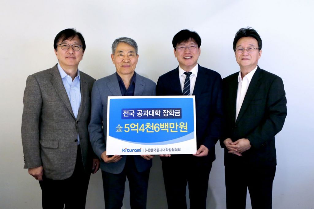 귀뚜라미그룹 ‘전국 공과대학 장학금 전달식’에서 (왼쪽 두 번째부터)귀뚜라미문화재단 권오경 이사장, 한국공과대학장협의회 최세휴 회장이 기념촬영을 하고 있다.