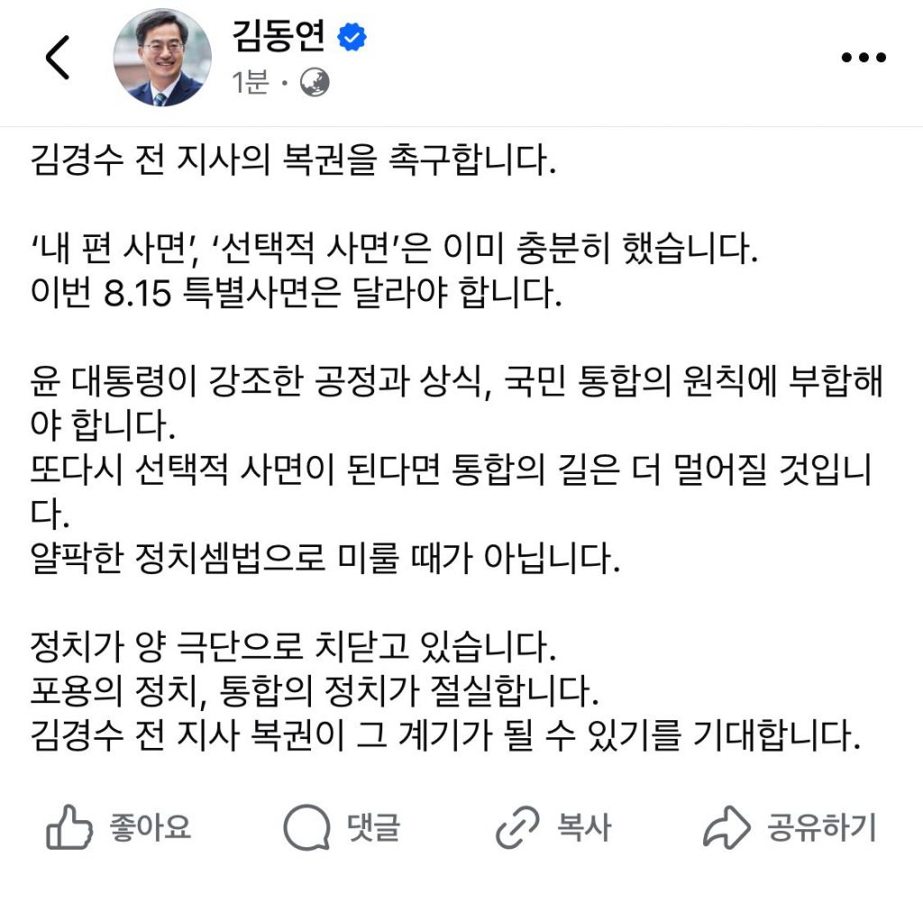 김동연 지사는 7일 자신의 사회관계망서비스(SNS)에 올린 글에서 "김경수 전 지사의 복권을 촉구한다"며 "‘내 편 사면’, ‘선택적 사면’은 이미 충분히 했다"고 주장했다.