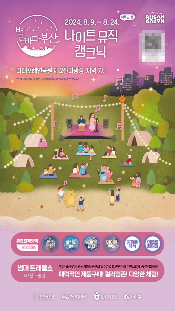 부산시는 한국관광공사(사장직무대행 서영충), 부산관광공사(사장 이정실)와 함께 작년에 이어 올해도 다대포 해변공원에서 ‘2024 별바다부산 나이트 뮤직 캠크닉’을 개최한다.