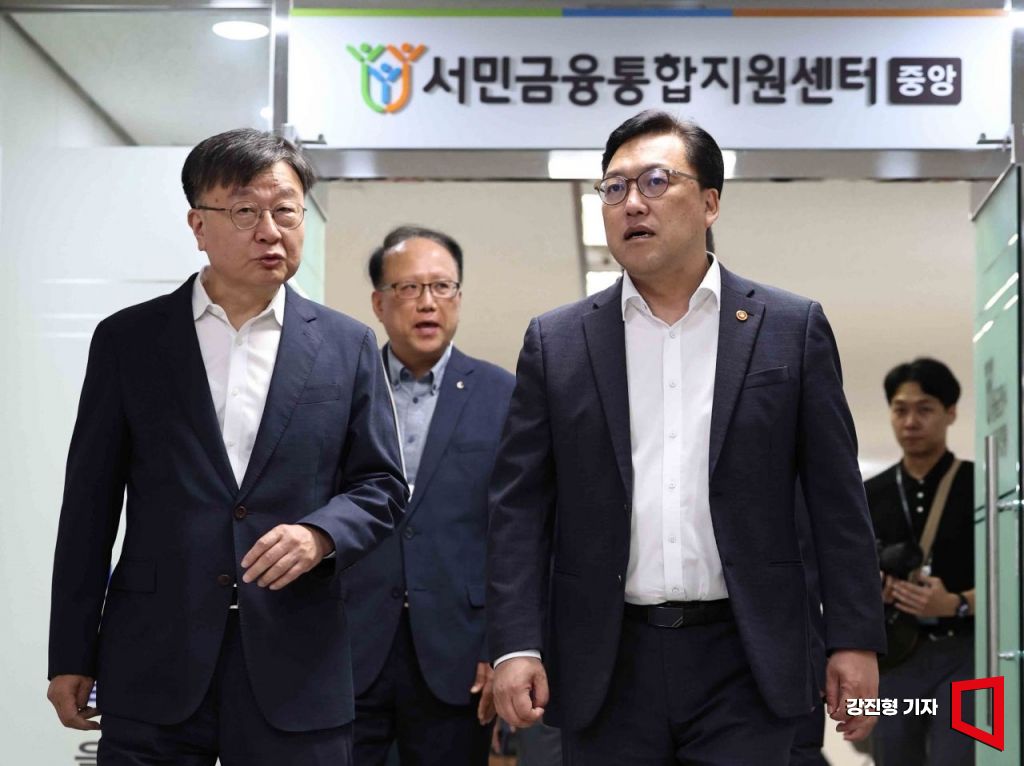 김병환(오른쪽) 금융위원장과 이재연 서민금융진흥원장 겸 신용회복위원장이 7일 서울 중구 중앙 서민금융통합지원센터에서 서민금융 지원 현장방문을 마치고 간담회장으로 이동하고 있다.