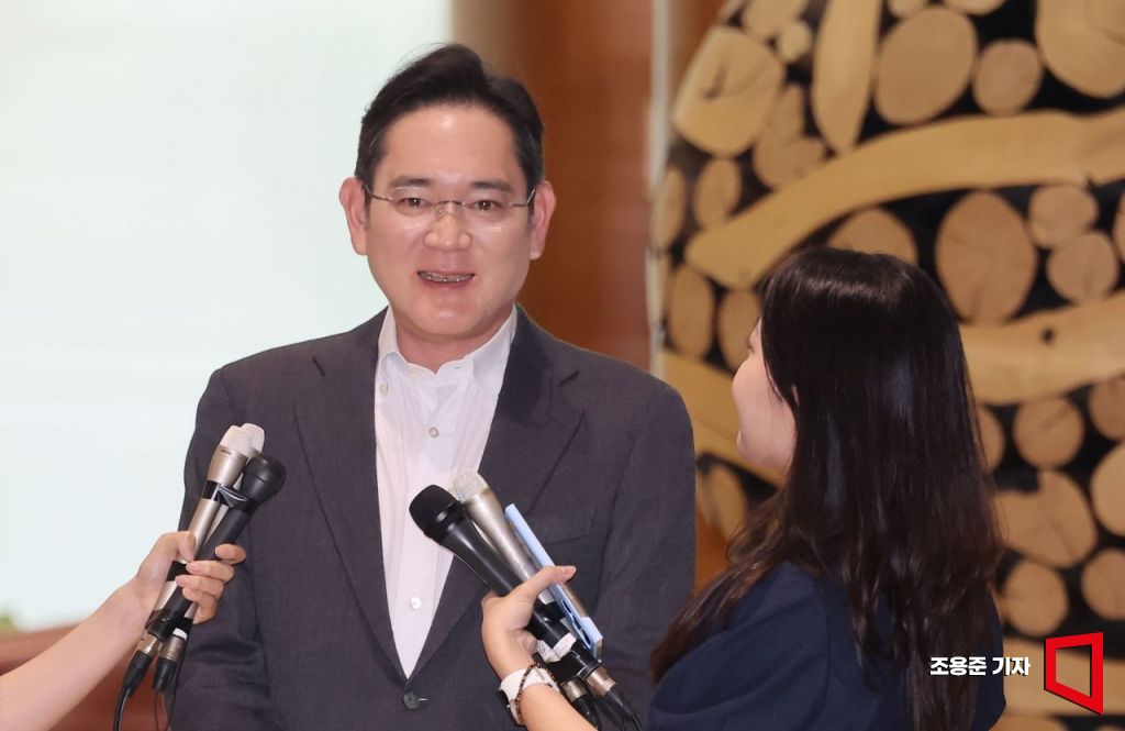 이재용 삼성전자 회장이 파리 올림픽 출장을 마치고 7일 오후 서울 강서구 서울김포비즈니스항공센터(SGBAC)를 통해 귀국하며 기자들의 질문에 답하고 있다. 사진=조용준 기자 jun21@