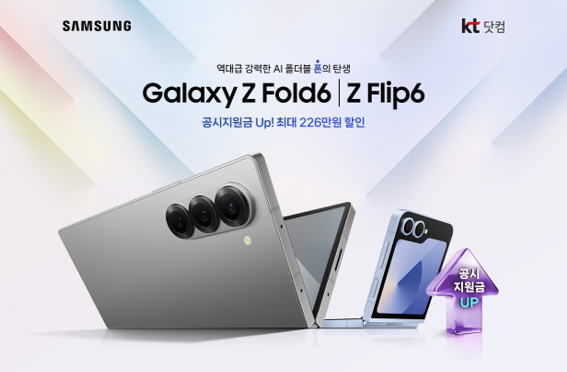 KT는 삼성전자의 폴더블 폰 '갤럭시 Z폴드6·플립6' 공시지원금을 최대 50만원까지 확대하고 공식 온라인몰 KT닷컴에서 프로모션을 진행한다고 8일 밝혔다.