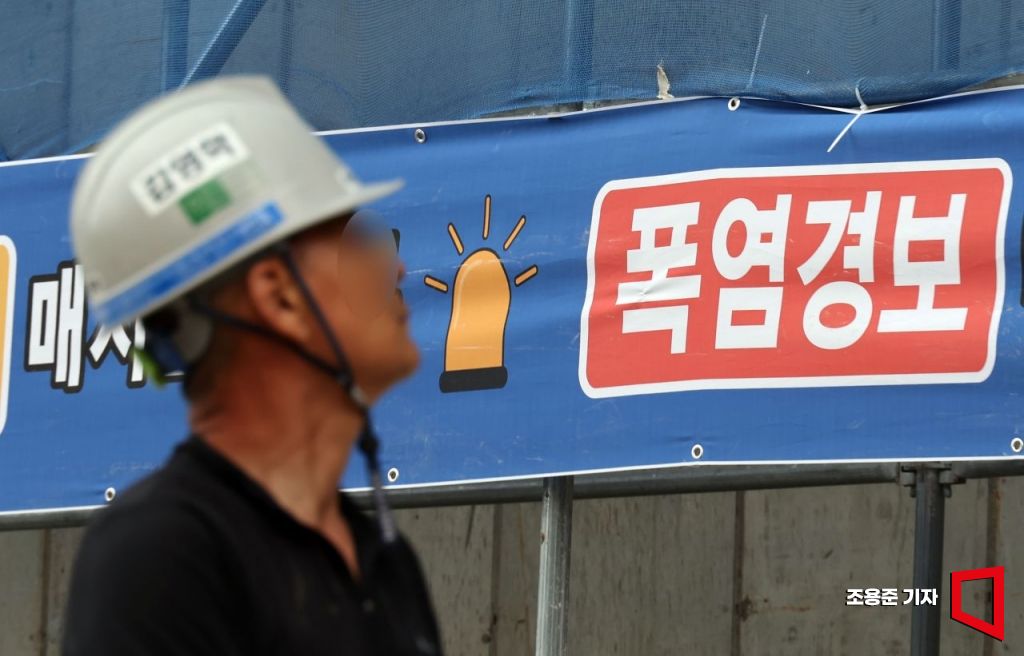 폭염이 연일 이어지고 있는 8일 서울 성북구 장위동의 한 건설현장에 근로자들이 일을 하고 있다. 사진=조용준 기자 jun21
