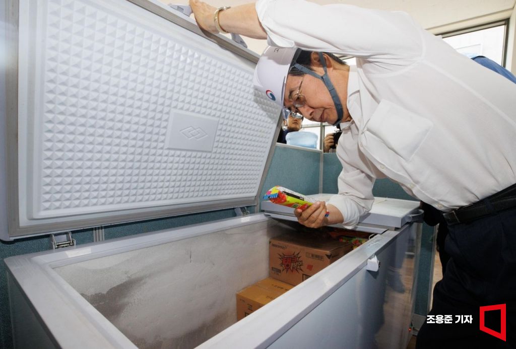 한덕수 국무총리가 8일 오전 폭염 대응 건설현장 점검차 서울 성북구 장위4구역 주택정비사업지구를 방문해 제빙기를 살펴보고 있다. 사진=조용준 기자 jun21@