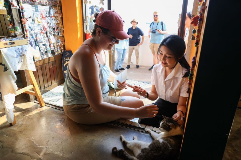 김건희 여사가 7일 부산 감천문화마을을 탐방하던 중 카자흐스탄 외국인을 만나 대화를 나누고 있는 모습. 대통령실 제공