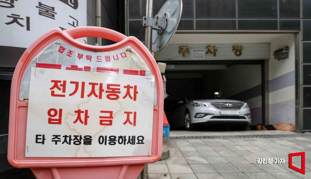 전기차 화재가 잇따르면서 전기차 안전성에 대해 관심이 커지고 있는 8일 인천 한 지하주차장 입구에 전기차 출입금지 안내문이 붙어 있다.