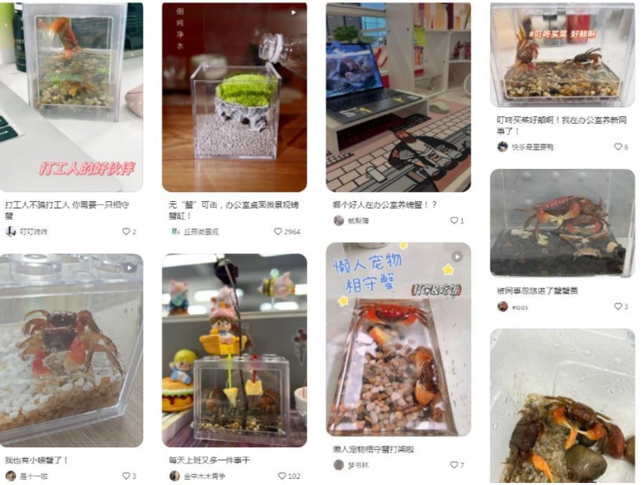 최근 중국 관영 매체 신화사는 중국의 젊은 직장인들이 '게'를 최고의 '일동무'로 여기고 있다고 보도했다. 한 회사에서 비서직으로 근무 중인 2000년대생 A씨는 "일에 집중한 후, 데스크에 있는 작은 게에 먹이를 준다"며 "먹이 먹는 모습을 보면서 나도 안정을 취할 수 있다"고 말했다. 게가 먹이를 먹는 모습을 찍은 영상 등은 사회관계망서비스(SNS)에서도 인기가 높다. 중국 SNS인 샤오홍슈에도 '게 사육 기록'이라는 제목으로 게 관련 영상이 잇달아 올라오고 있다.