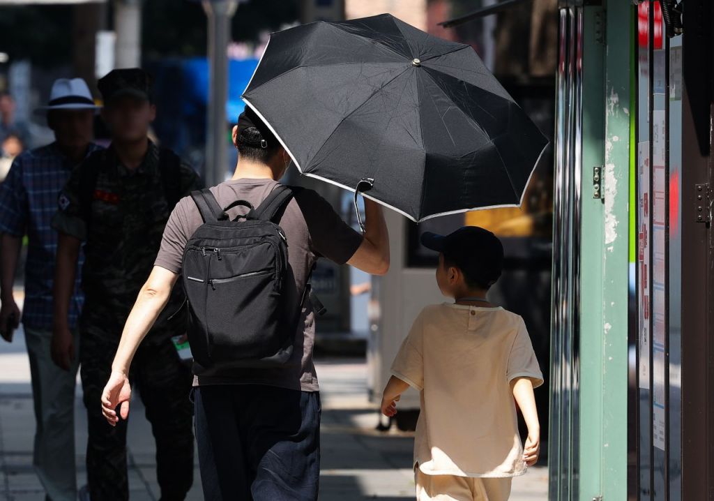 전국 대부분 지역에 폭염 특보가 이어진 9일 대구 중구 동성로에서 한 시민이 자녀에게 양산을 씌워주며 이동하고 있다. [이미지출처=연합뉴스]