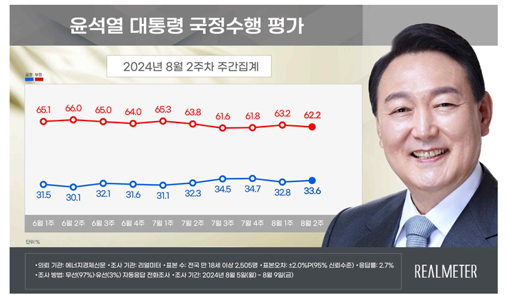 여론조사업체 리얼미터가 12일 공개한 여론조사(에너지경제신문 의뢰로 지난 5∼9일 전국 18세 이상 유권자 2505명을 대상으로 무선(97%)·유선(3%) 자동응답 전화조사 방식 조사)에 따르면 윤 대통령의 국정 수행 지지율은 지난 조사보다 0.8%포인트 오른 33.6%로 나타났다. 국정 수행 부정 평가는 일주일 전보다 1.0%포인트 낮은 62.2%포인트였다.