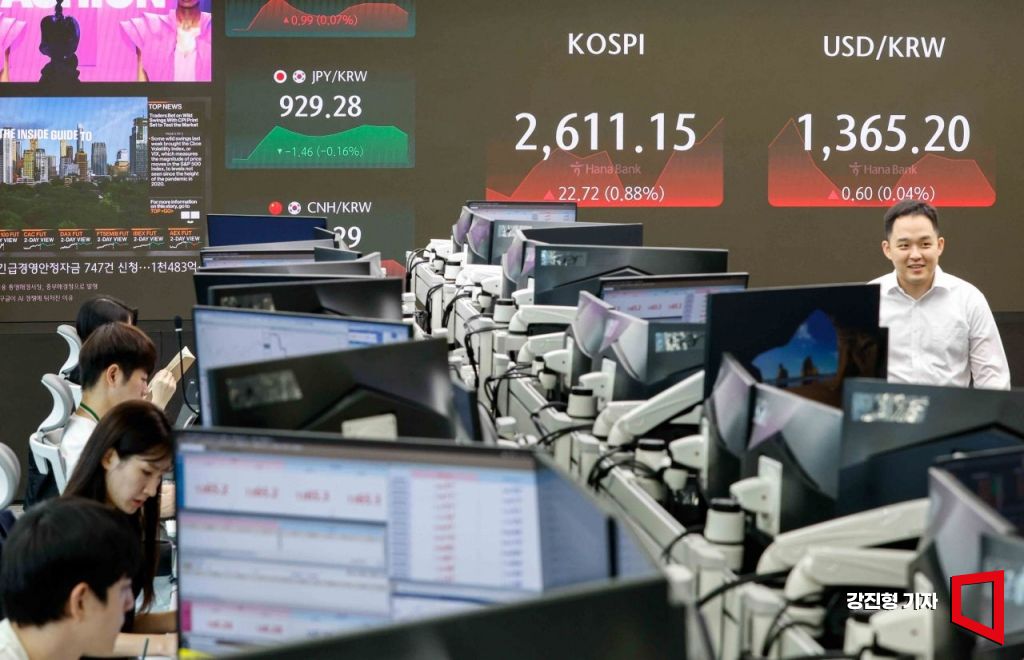 코스피 지수가 전 거래일 대비 13.73포인트(0.53%) 상승한 2602.16으로 장을 시작한 12일 서울 중구 하나은행 본점 딜링룸에서 딜러들이 업무를 보고 있다.