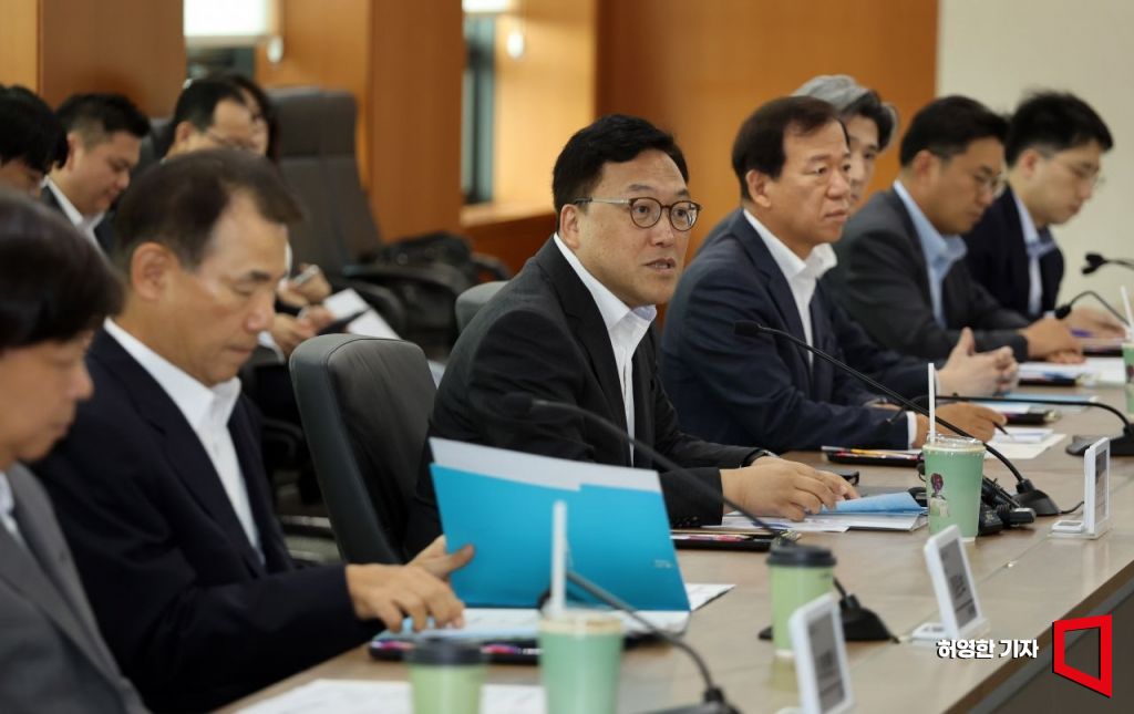 금융위원회 주최 기업 밸류업을 위한 상장기업 간담회가 12일 서울 여의도 한국거래소에서 열렸다. 김병환 금융위원장이 모두발언을 하고 있다. 김 위원장 왼쪽은 정은보 한국거래소 이사장, 오른쪽은 서유석 금융투자협회장.