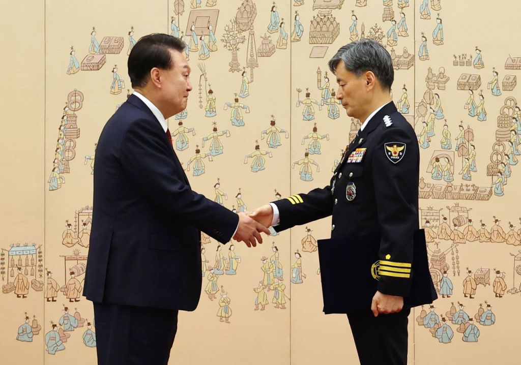 윤석열 대통령이 12일 서울 용산 대통령실 청사에서 열린 임명장 수여식에서 조지호 경찰청장에게 임명장을 수여한 뒤 악수하고 있다. [이미지출처=연합뉴스]