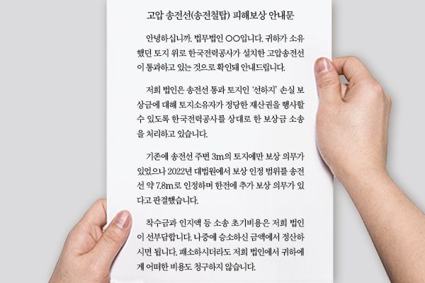 A 씨는 최근 집에 도착한 우편물에 깜짝 놀랐다. 변호사 사무실과 로펌에서 두 아들 앞으로 우편물을 보내온 것이다. ‘혹시 아들에게 무슨 일이 생긴 것은 아닐까’하는 마음에 심장이 쿵 내려앉는 기분이었다고 한다. 봉투를 열어보니 ‘우리 로펌을 통해 선하지 보상을 받으라’며 법무법인 등 변호사가 보낸 소송 안내문이 들어있었다. A 씨의 아들이 소유한 토지 위로 고압 송전선이 지나가고 있는데, 한국전력공사에 소송을 내면 보상을 받을 수 있으니 자신의 로펌에 사건을 맡겨달라는 내용이었다.