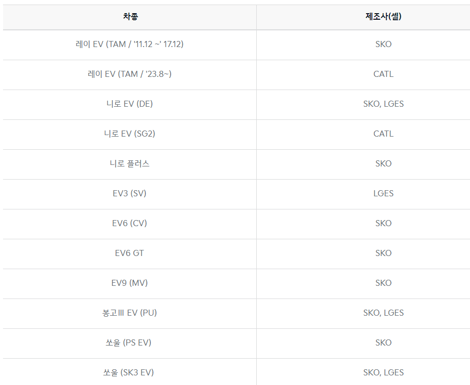 구형 레이 EV, 2세대 쏘울, 니로 플러스, EV6, EV6 GT, EV9 등에는 SK온 배터리가 탑재됐으며 EV3에는 LG에너지솔루션에서 만든 배터리가 쓰였다.