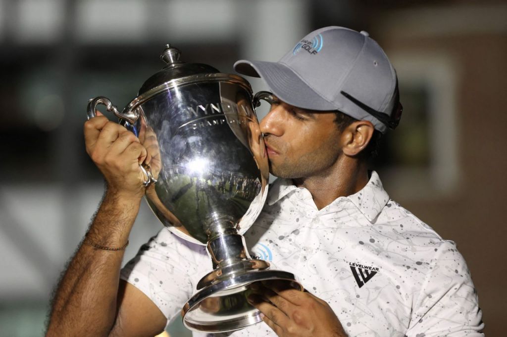 에런 라이가 윈덤 챔피언십 우승 직후 트로피에 입맞춤을 하고 있다. [그린즈버러(미국)=AFP·연합뉴스]