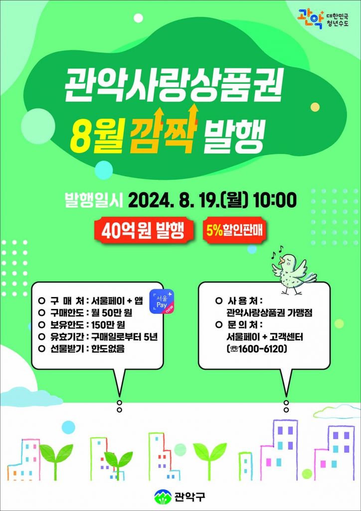 관악구(구청장 박준희)가 막바지 휴가철을 맞아 19일 오전 10시부터 40억 원 규모의 관악사랑상품권을 발행한다.