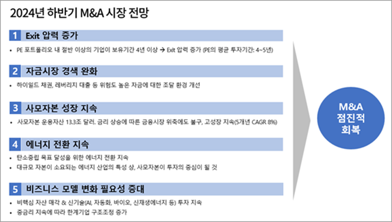 보고서에 따르면 올해 상반기 초 금리 인하가 지연되고 투자 심리가 악화하며, M&A 시장의 부진이 지속됐다. 반면 하반기엔 고금리와 선거 등 정치적 현안이 마무리되는 국면을 맞으면서 M&A 시장을 둘러싼 환경이 개선되고, 투자 심리가 회복될 전망이다.
