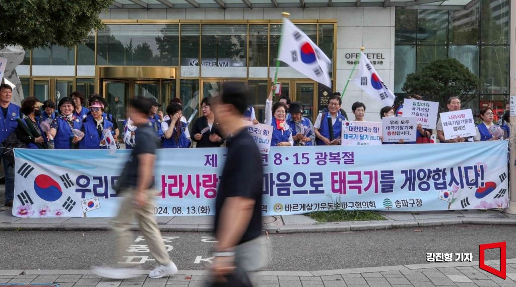 제79주년 광복절을 이틀 앞둔 13일 서울 송파구 잠실역에서 바르게살기운동송파구협의회 소속 관계자들이 광복절 태극기 게양 캠페인을 펼치고 있다.