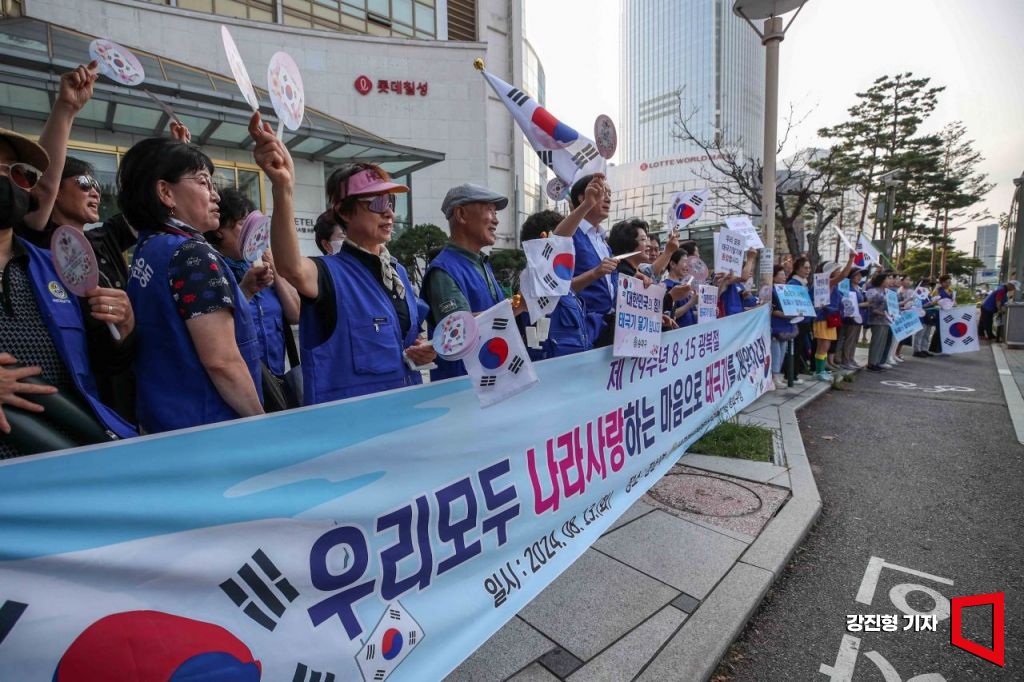 제79주년 광복절을 이틀 앞둔 13일 서울 송파구 잠실역에서 바르게살기운동송파구협의회 소속 관계자들이 광복절 태극기 게양 캠페인을 펼치고 있다.