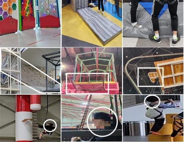 익스트림 체험기구를 즐길 수 있는 실내 스포츠 테마파크 일부 시설에서 드러난 안전사고 예방 미흡 사례. 충격흡매트와 안전망을 제대로 설치하지 않거나 안전모를 미제공하는 업체들이 다수 존재하는 것으로 나타났다. [사진제공=한국소비자원]
