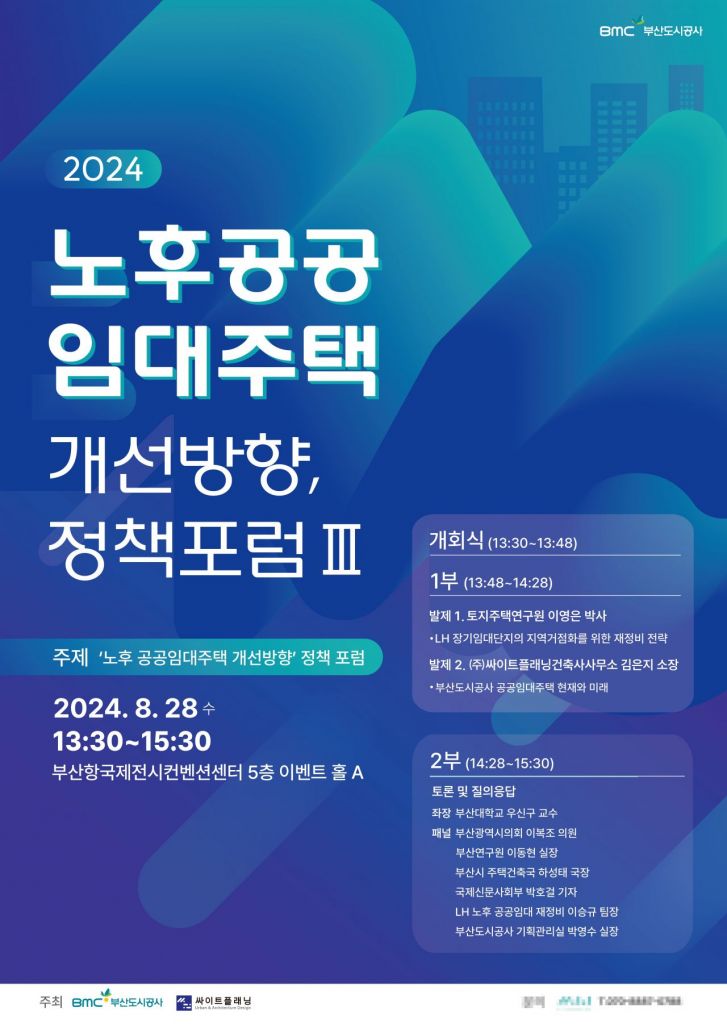 부산도시공사(BMC, 사장 김용학)는 오는 28일 부산항국제전시컨벤션센터에서 ‘노후 공공임대주택의 개선 방향’ 주제 3번째 정책 포럼을 진행한다.