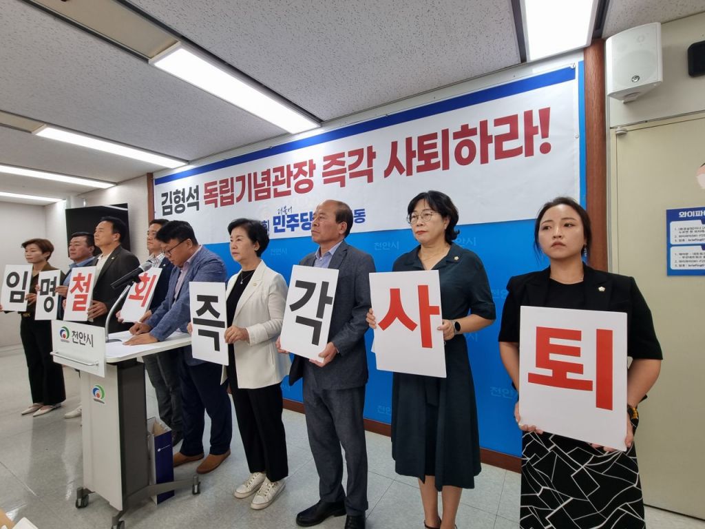 13일 천안시의회 민주당 소속 시의원들은 천안시청브리핑실에서 기자회견을 개최하고 김형석 독립기념관장에 대한 임명철회를 주장했다.