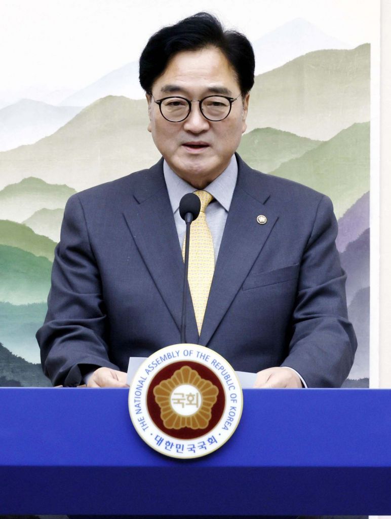 우원식 국회의장이 24일 국회에서 방송법 중재안 등 국회 현안 관련 긴급 기자회견을 하고 있다. 사진=김현민 기자 kimhyun81@