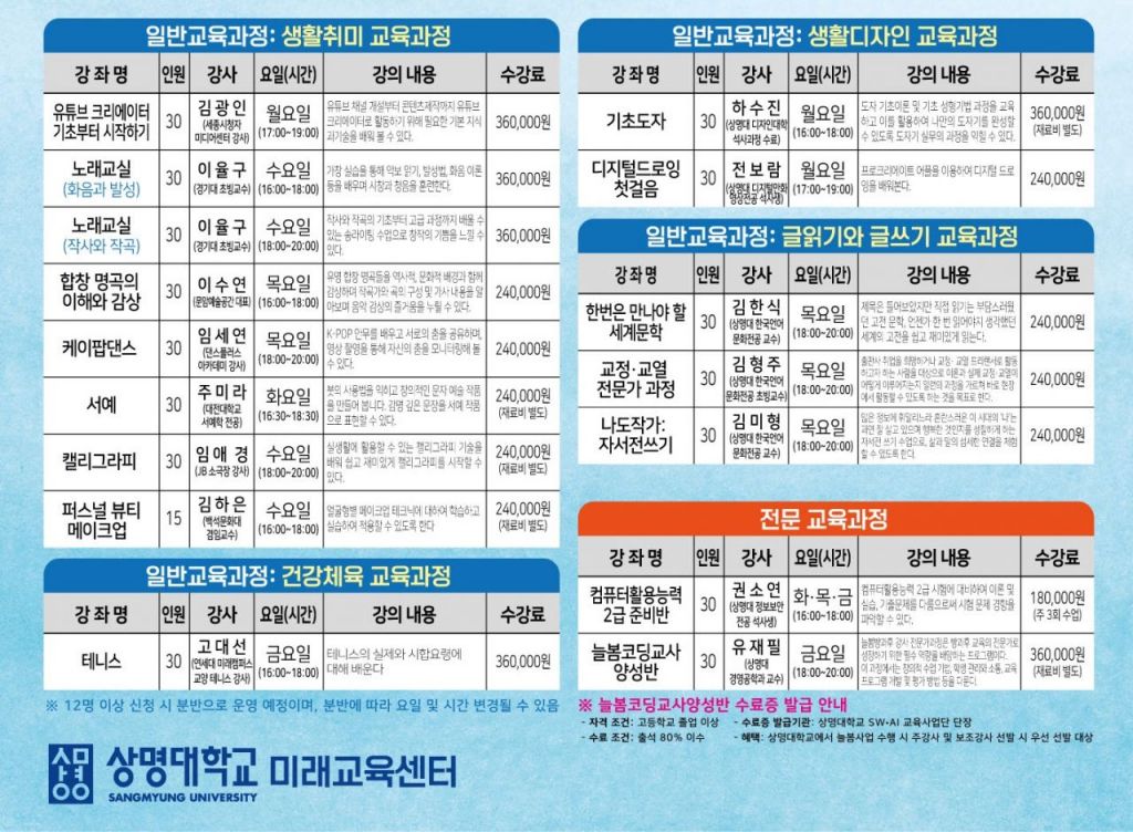 개설되는 프로그램은 유튜브 크리에이터 기초부터 시작하기, 노래 교실, 합창 명곡의 이해와 감상, 늘봄코딩교사양성반 등 16개 강좌다.