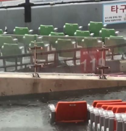 관중석도 무사하지는 못했다. 오렌지색 응원석 앞줄은 아예 물에 잠길 지경이 됐다. 일부 팬들은 경기를 앞두고 물바다가 된 구장·사진 영상 등을 촬영해 사회관계망서비스(SNS) 등에 공유했다.