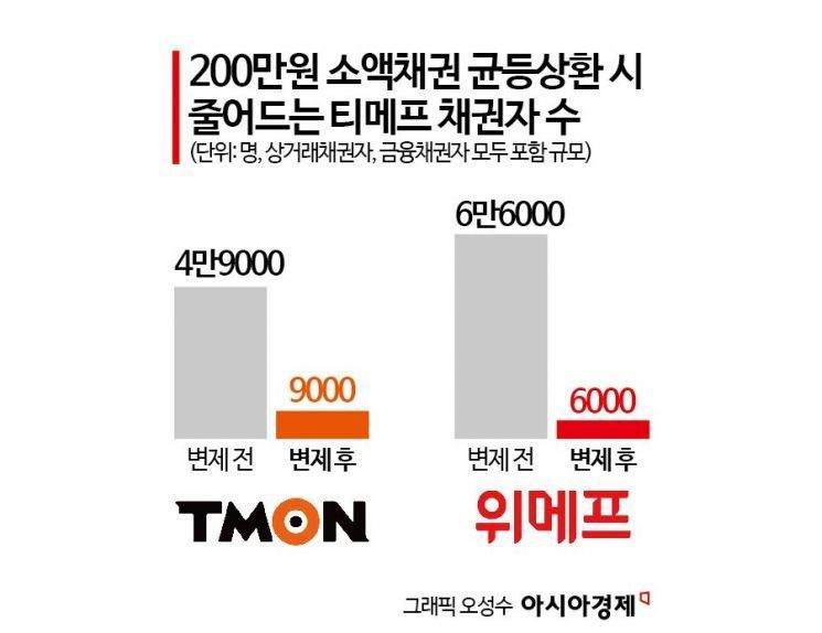 위메프도 같은 방식으로 6만6000명의 소액채권자 수를 6000명대로 줄일 수 있다고 한 것으로 전해졌다. 11만5000명에서 10만명 줄어든 1만5000명 내외로 티메프 채권자 수의 몸집을 슬림화해 미정산 대금을 먼저 해결하고, 회생 의사결정 구조를 효율화하겠다는 것이다. 약 2000억원의 소액채권 변제 비용과 관련해 티메프 측은 아시아경제에 “자구안에 유치 방법과 노력 중인 상황을 기재했다”고 밝혔다.