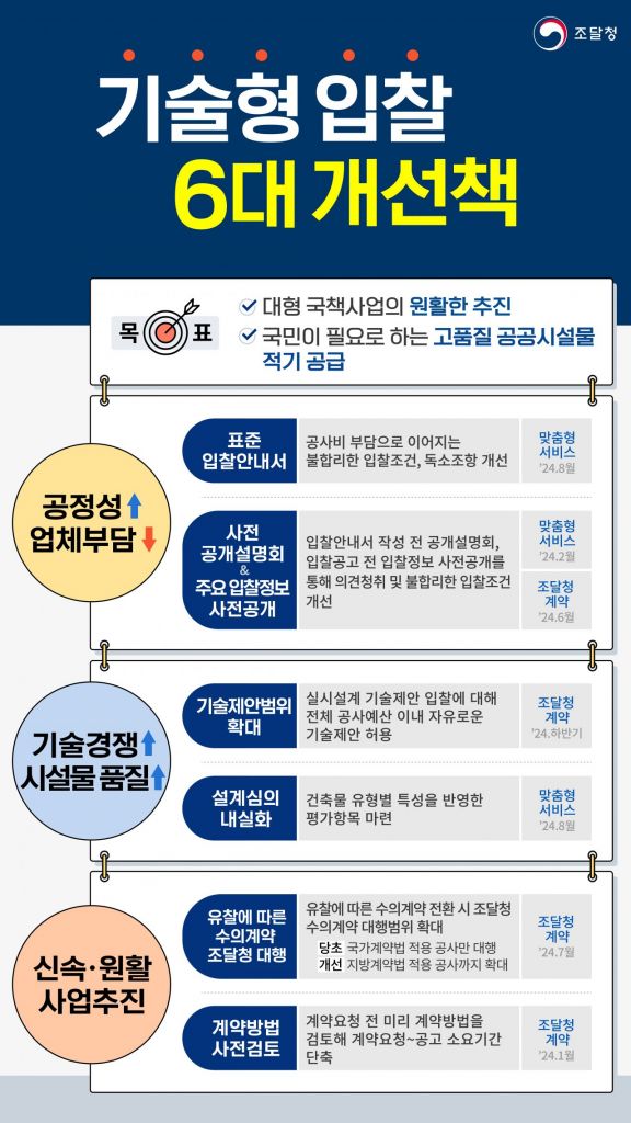 조달청은 대형 건설공사의 원활한 추진을 지원하기 위해 기술형 입찰의 입·낙찰제도와 집행 절차·방법 등을 두루 손질하는 종합 개선 조치를 시행한다고 14일 밝혔다.