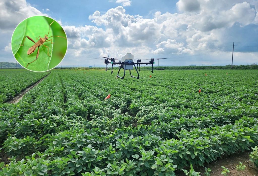 콩 병해충 드론 방제.[사진제공=전북농기원