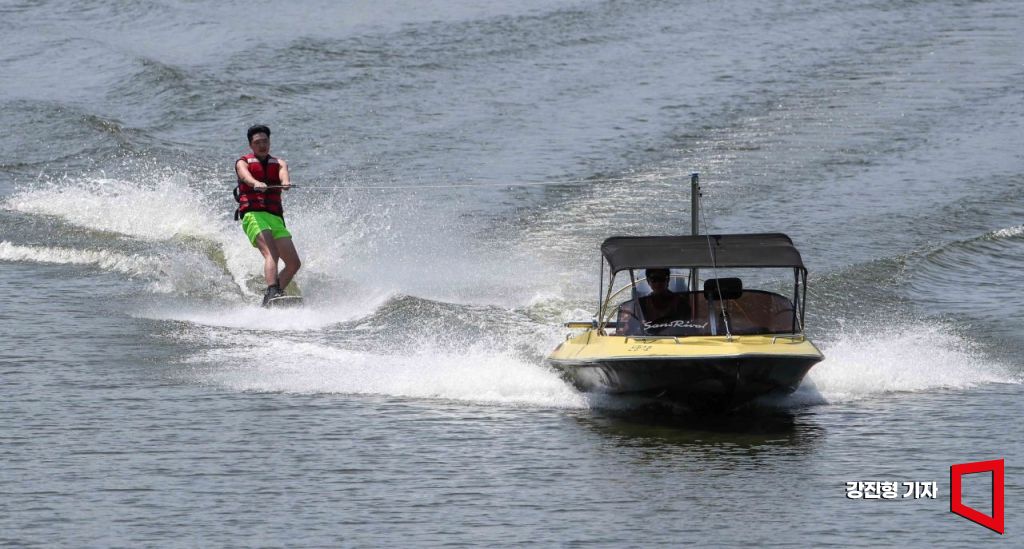 전국적으로 폭염이 이어지고 있는 14일 충남 아산 신정호를 찾은 피서객이 웨이크보드를 타며 더위를 식히고 있다.