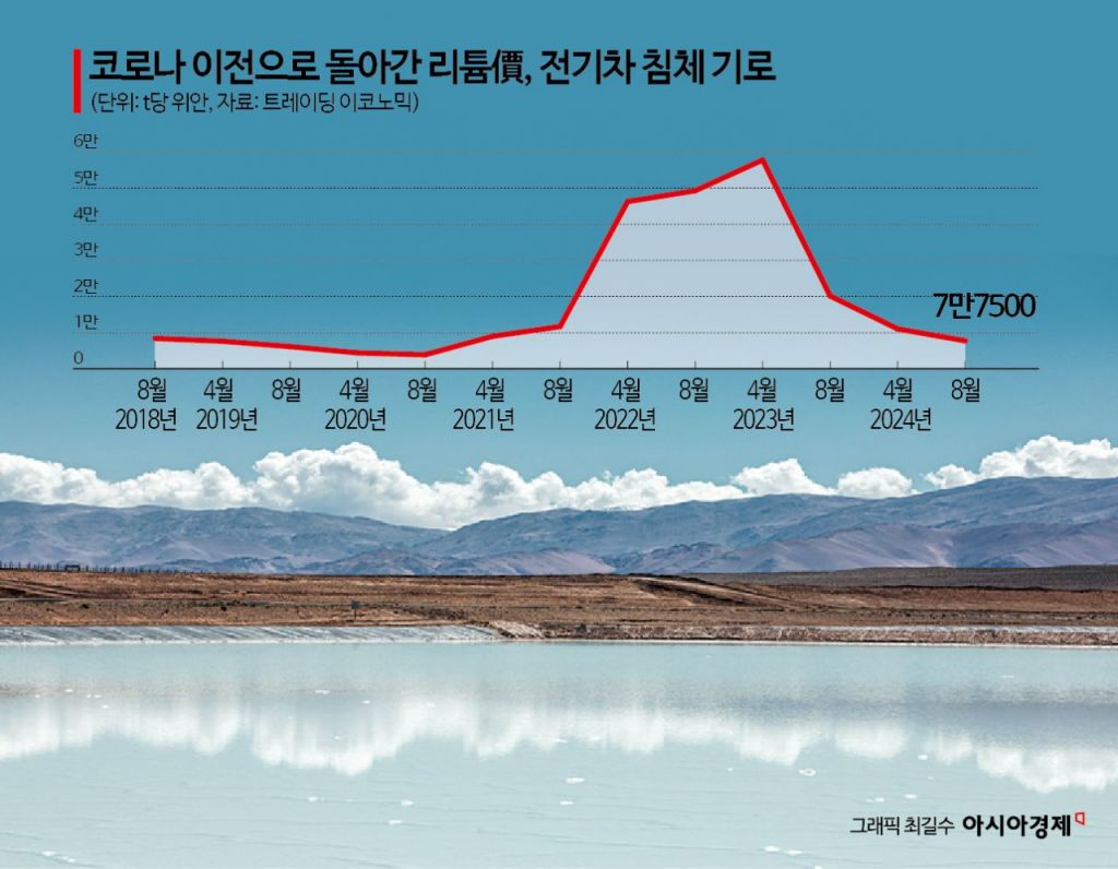 그러나 역사상 최고점을 찍은 후 2년 가까이 리튬 가격은 하락세를 면치 못하고 있다. 돈되는 리튬에 달려든 광산 기업의 공급량이 많아지고 급증할줄만 알았던 전기차 수요가 예상을 밑돌았기 때문이다. 최고점을 찍은 후 불과 6개월만에 17만위안까지 떨어졌던 리튬 가격은 현재 7만위안대 까지 떨어졌다.
