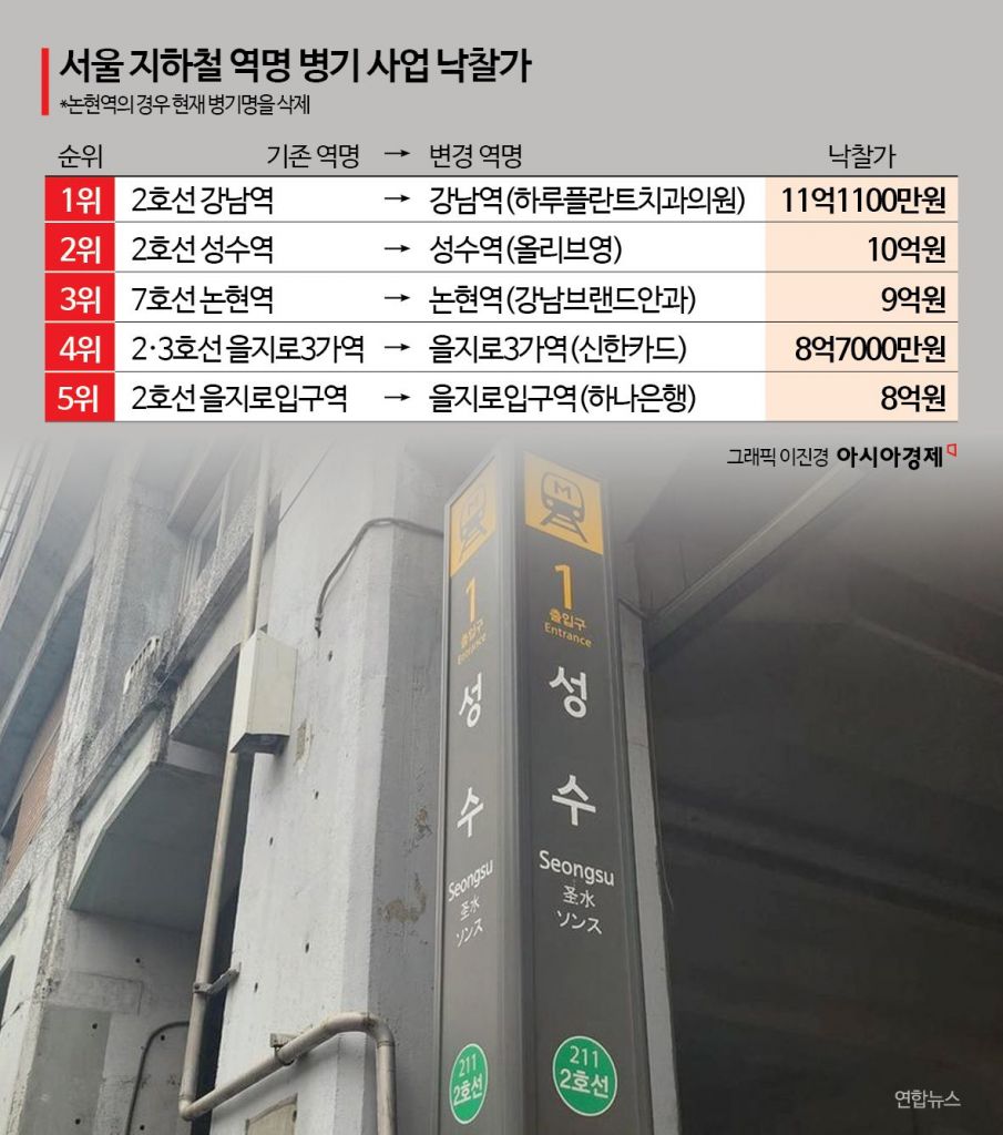 역대 최고 낙찰가를 기록한 강남역은 올 10월부터 '강남역(하루플란트치과의원)'으로 표기된다. 해당 병원이 11억1100만원에 부역명을 낙찰받으면서다. 역대 낙찰가 3위에 오른 7호선 논현역도 모 안과가 9억원에 낙찰받았으나 현재는 병기명을 삭제한 상태다. 부역명을 낙찰받으면 지하철역이나 출입구, 승강장, 안전문 등에 기관·기업명이 함께 표기돼 홍보 효과가 크기 때문에 유동 인구가 많은 오피스 상권이 인기가 많은 것으로 보인다.