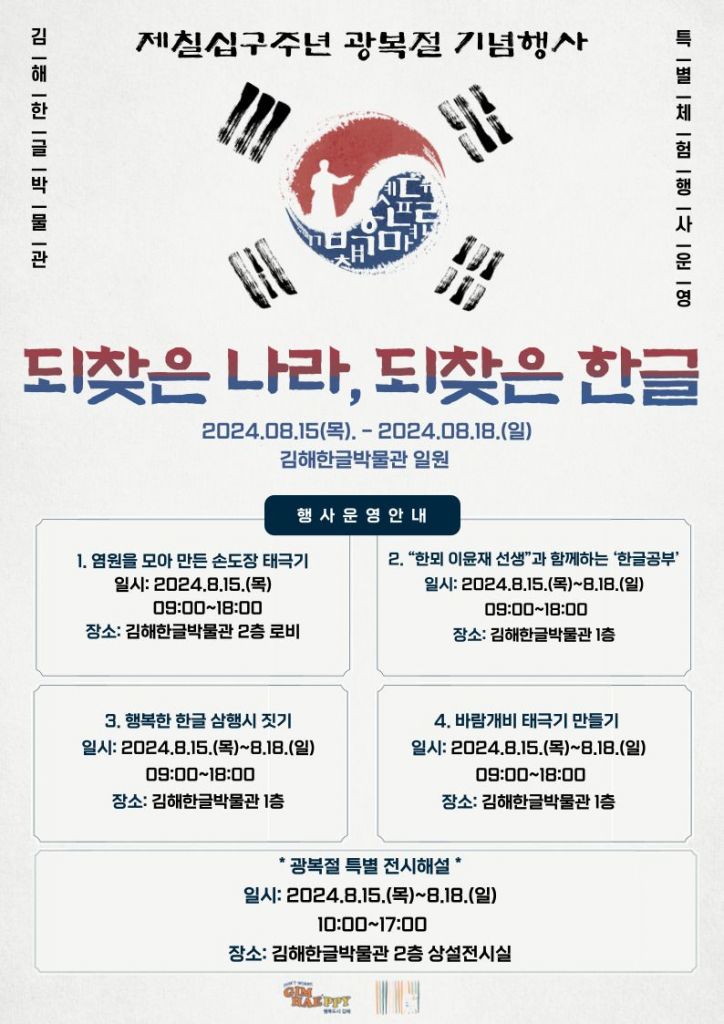 경남 김해시가 제79주년 광복절을 맞아 김해한글박물관에서 다양한 체험행사와 특별전시를 선보인다.