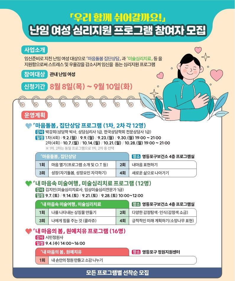 영등포구(구청장 최호권)가 9월부터 난임 시술 등 임신 준비로 스트레스를 겪고 있는 여성 등을 대상으로 ‘우리 함께 쉬어갈까요!’ 프로그램을 운영한다고 밝혔다.