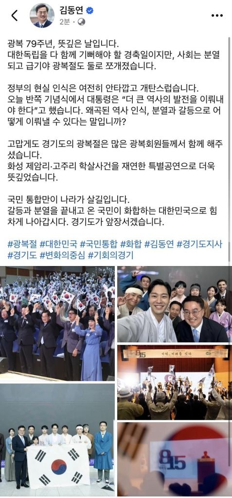김동연 경기도지사가 15일 광복절을 맞아 자신의 SNS에 올린 글과 사진