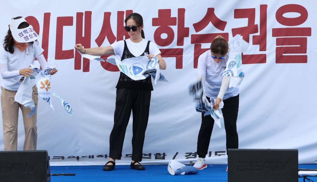 전국의대생학부모연합과 경기도의사회는 광복절인 15일 의대 증원 백지화를 촉구하는 집회를 열었다.