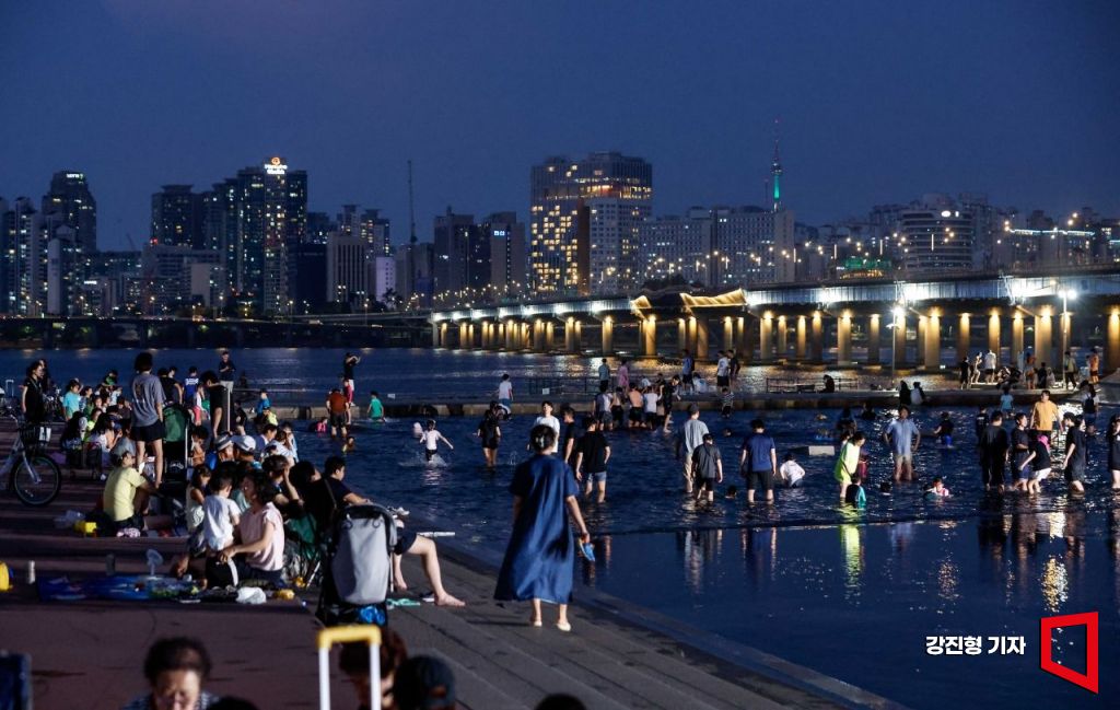 열대야가 26일째 이어지고 있는 15일 서울 여의도 한강공원을 찾은 시민들이 물놀이를하며 더위를 식히고 있다. 서울의 열대야는 지난달 21일부터 이날까지 26일째 이어지면서 2018년과 같이 역대 가장 긴 열대야를 기록했다.