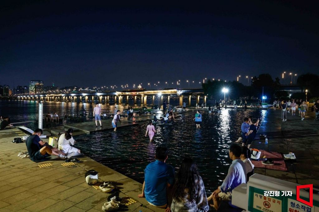 서울 여의도 한강공원을 찾은 시민들이 물놀이를 하며 더위를 식히고 있다. [사진=강진형 기자]