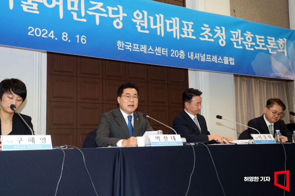 박찬대 더불어민주당 원내대표 초청 관훈토론회가 16일 서울 프레스센터에서 열렸다. 박 원내대표가 토론에 앞서 기조연설을 하고 있다. 사진=허영한 기자 younghan@