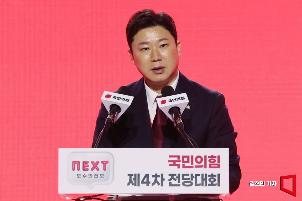 진종오 국민의힘 청년 최고위원이 23일 오후 경기 고양시 킨텍스에서 열린 국민의힘 제4차 전당대회에서 수락연설을 하고 있다. 사진=김현민 기자 kimhyun81@