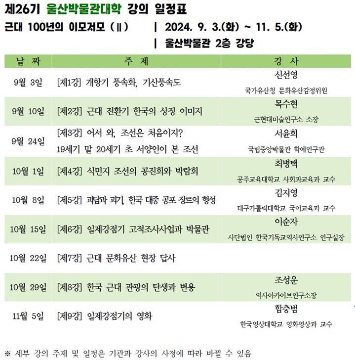 울산박물관 측은 “이번 학기는 우리나라 근대사의 다양한 면모를 알아볼 수 있는 강의들로 구성했다”며 “수확의 계절인 가을을 맞아 박물관에서 배움이 영글어 가는 기쁨을 느껴 보시기를 바란다”라고 권했다.